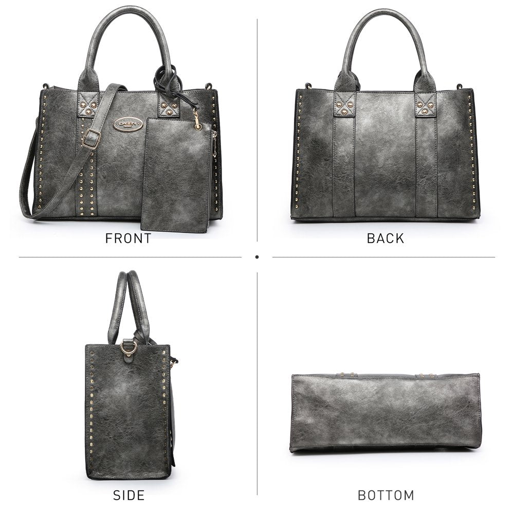 ❤ Design:Roomy enough to pack your essentials for a quick weekend getaway or a laptop for work, this medium tote bag will soon find its way to your heart! Its sleek, design makes it as versatile and functional, while a faux leather color-blocked fabrication lends a modern feel. New features with stud accents in front and alongside the edging of the bag, plus a detachable and removable matching organizer bag inside, which can be carried by itself or serve as a center divider, and a matching wristlet, makes this handbag becomes a "must-have" among all fashionista.