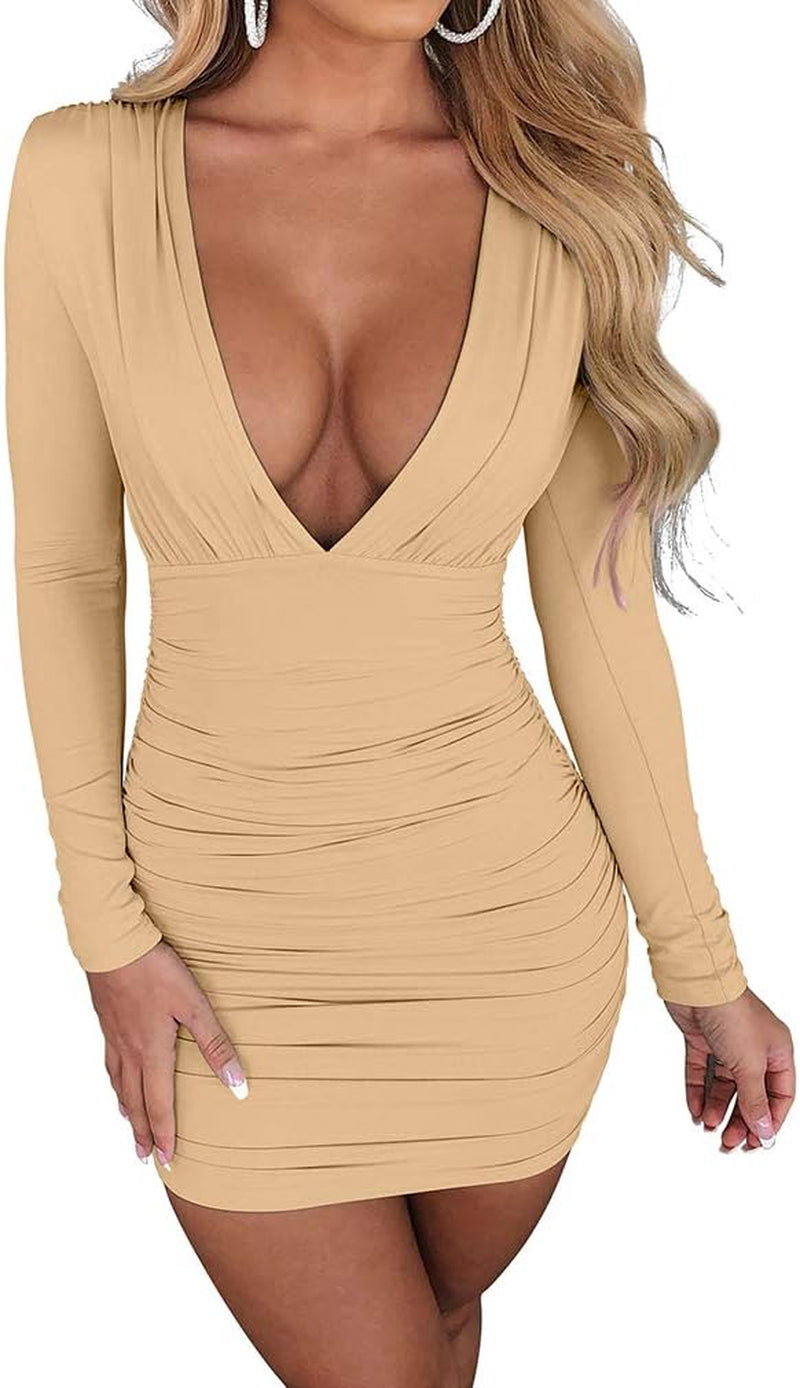 Women'S Sexy Bodycon Long Sleeve V Neck Ruched Mini Club Dress